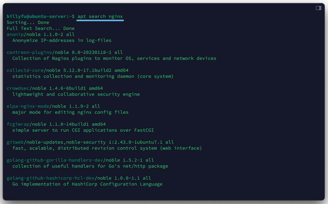 使用apt search命令,你可以在庞大的软件库中快速找到所需的软件包。例如,搜索 Nginx:
