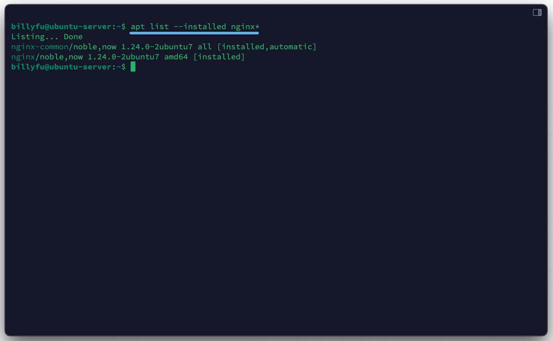 apt list命令可以显示所有已安装和可安装的软件包。如果你只想查看已安装的特定软件包,可以加上--installed参数,并配合通配符*进行模糊搜索。例如,查找所有已安装的包含nginx的软件包:
