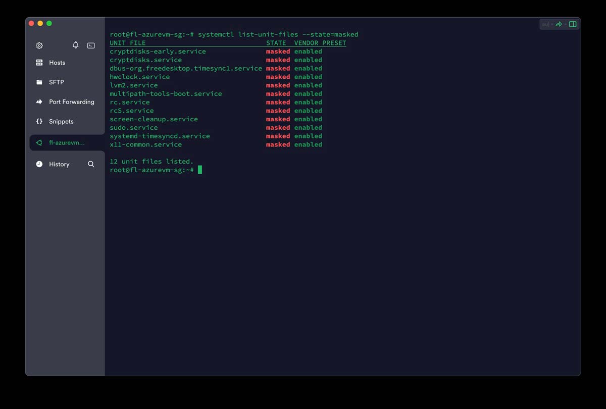 要查看 Linux 系统中有哪些服务被屏蔽并且无法手动或自动启动或停止,请在「终端」中运行此命令: