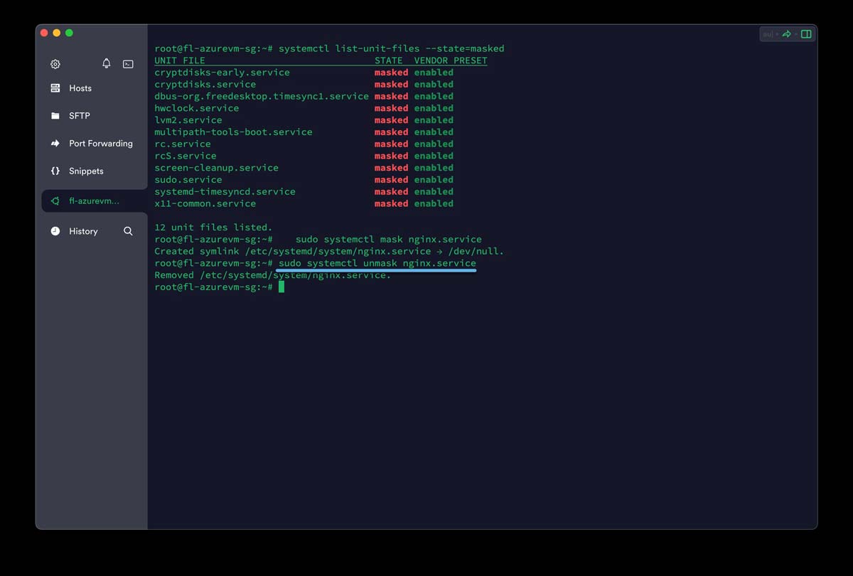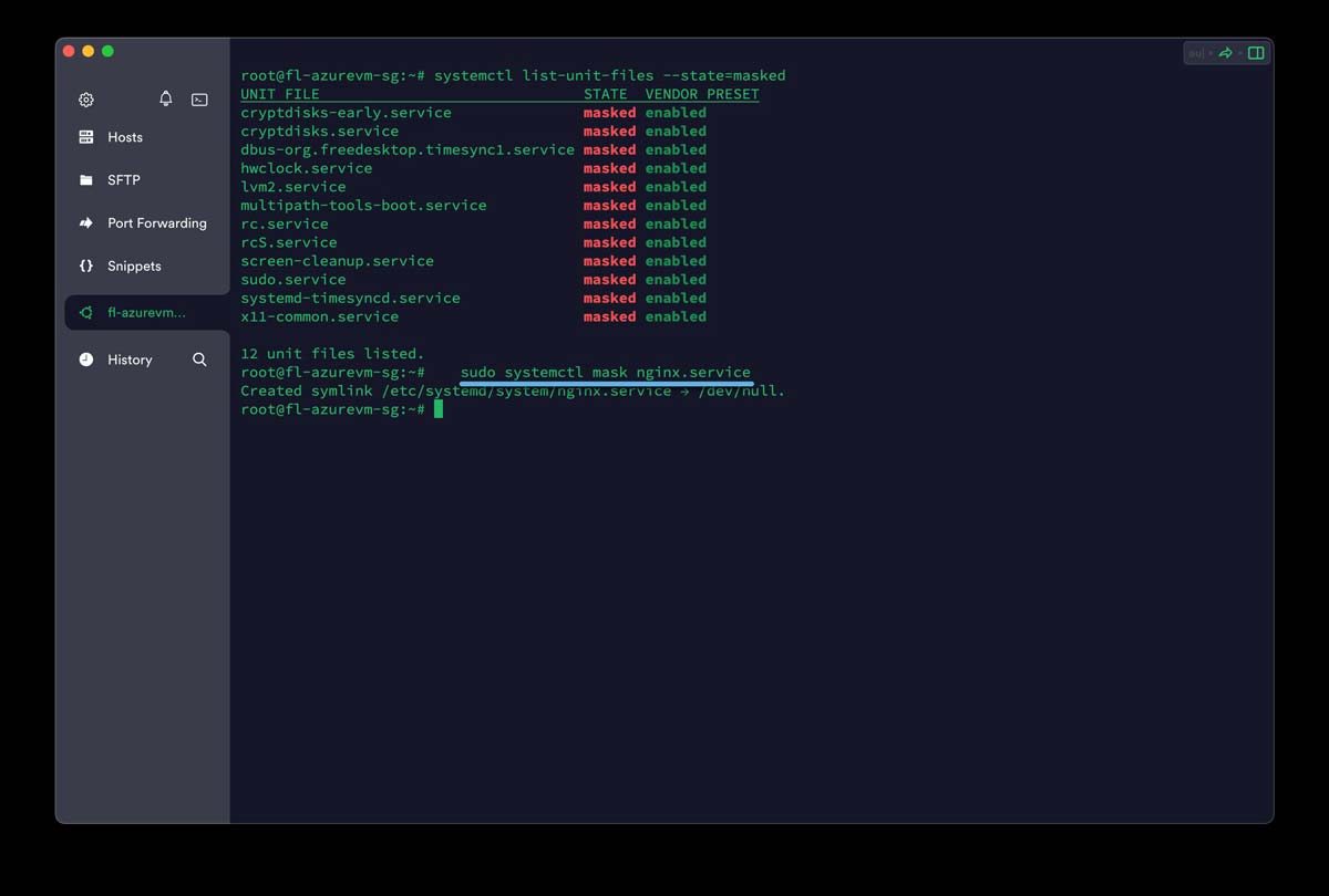 屏蔽服务是指将其单元文件链接到 /dev/null,从而防止 systemd 加载或操作它。这增加了额外的保护层。