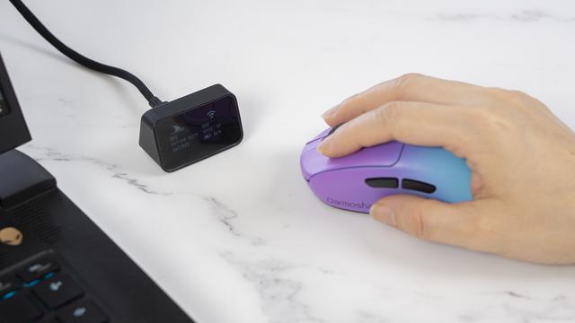 除了鼠标之外,还有一块可以显示DPI、回报率和电池电量剩余及信号强度的显示屏幕,确实挺好玩的。