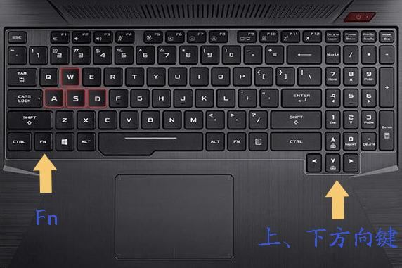 如果是笔记本电脑键盘的话,且键盘带有“亮灯”功能,在驱动正确安装的前提下,那么问题可能出在开关上,以华硕 飞行堡垒 6 笔记本电脑为例,键盘的灯需要额外开启才可以,需要按键盘上的“Fn+方向键↑或↓”才可以,通过该组合键可以关闭或开启键盘灯,还可以控制键盘灯的亮度。