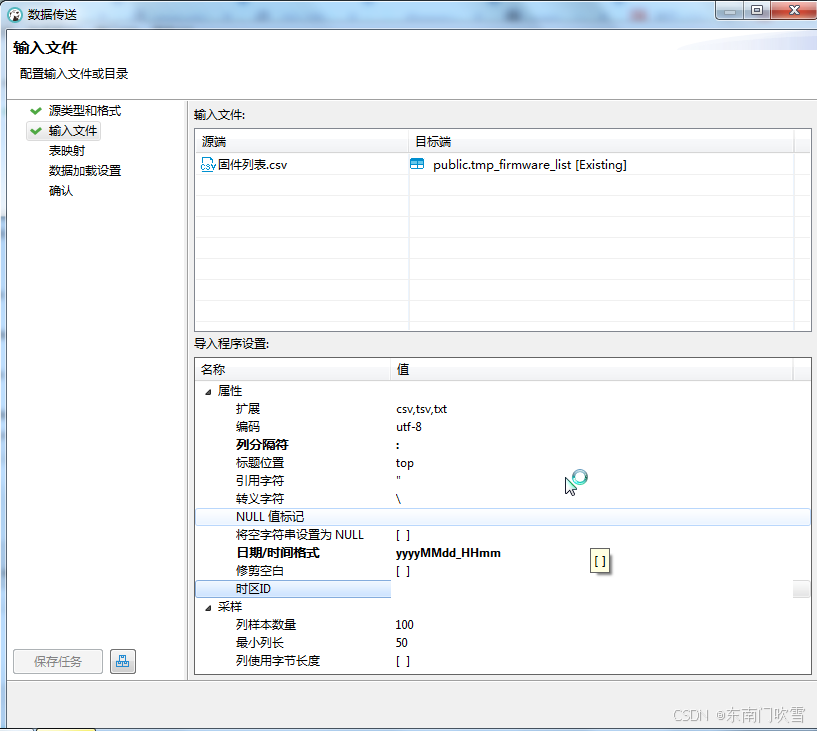 5.输入文件步骤项中,“导入程序设置”中,选择列分隔符(如“:”),选择“日期/时间"格式,如后面附图。