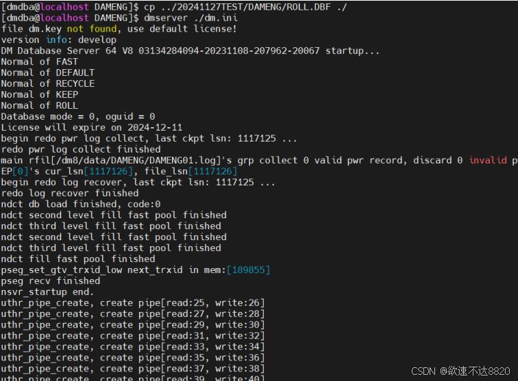 cp /dm8/data/PROD/ROLL.DBF /dm8/data/DAMENG/ #拷贝其他库的ROLL.DBF