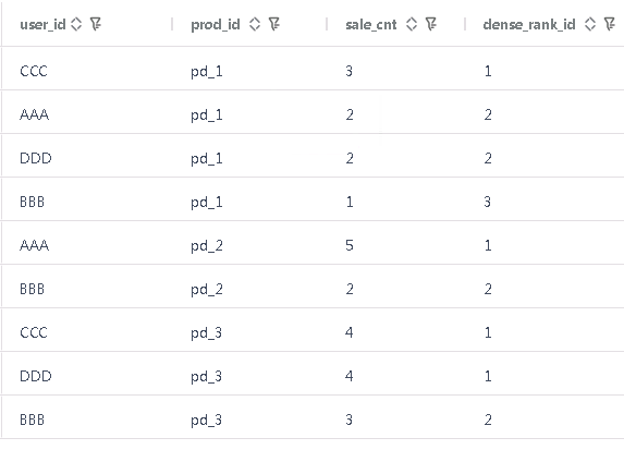 select *,row_number() over(partition by prod_id order by sale_cnt desc) row_id from rows_test ;select *,rank() over(partition by prod_id order by sale_cnt desc) rank_id from rows_test ;select *,dense_rank() over(partition by prod_id order by sale_cnt desc) dense_rank_id from rows_test ;