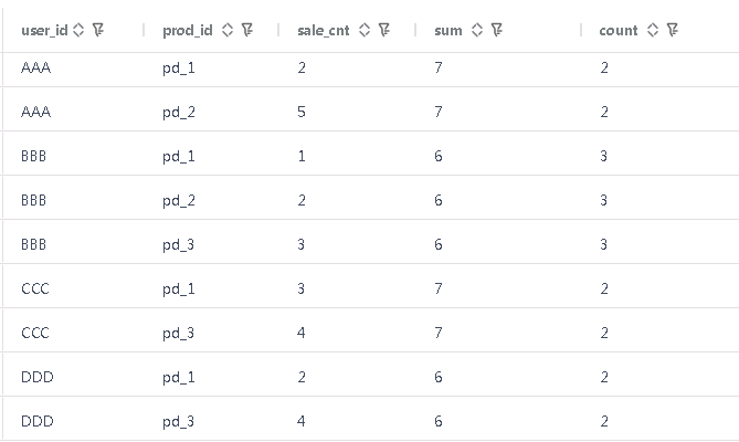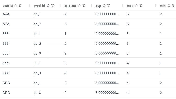 select *,sum(sale_cnt) over (partition by user_id),count(prod_id) over (partition by user_id),avg(sale_cnt) over (partition by user_id),max(sale_cnt) over (partition by user_id),min(sale_cnt) over (partition by user_id)from rows_test