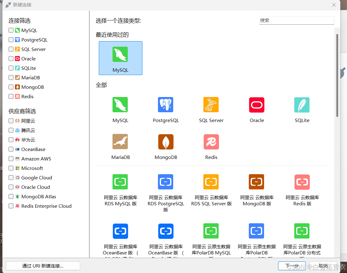- 在弹出的对话框中,选择对应的数据库类型(如MySQL、PostgreSQL等)。