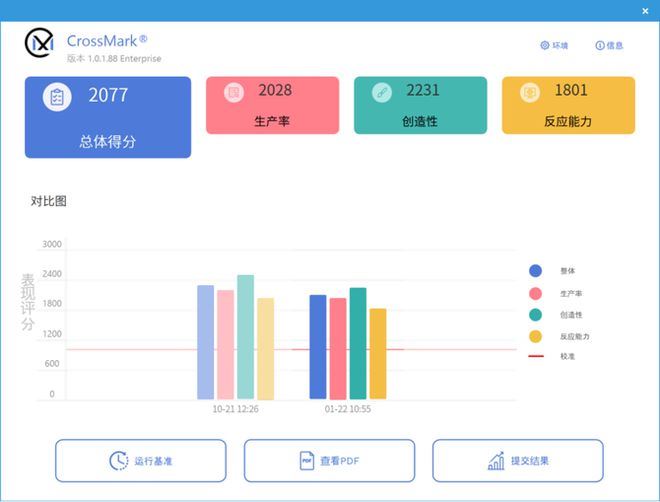 CrossMark测试上,我们可以看到酷睿Ultra 5 230F的总体得分为2077,其中生产率得分为2028,创造性得分为2231,反应能力得分为1801。