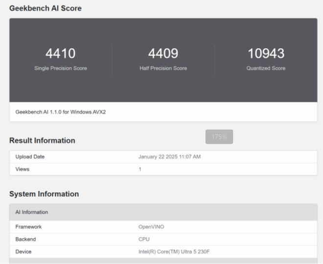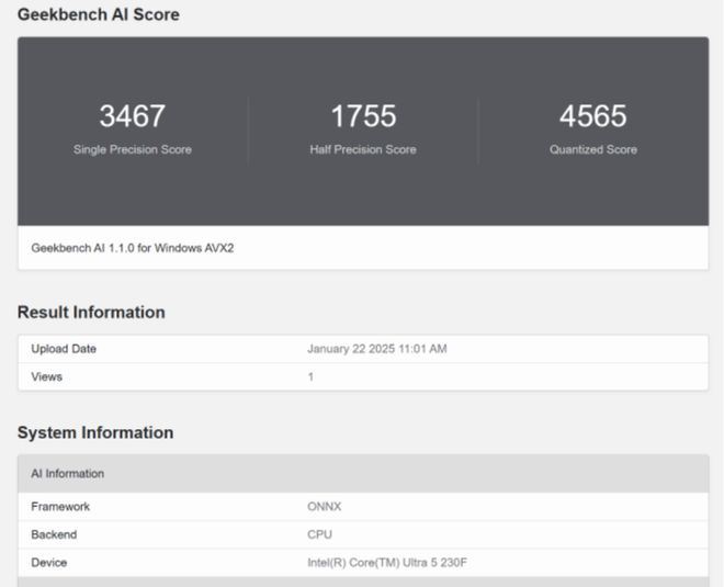 我们使用GeekBench AI功能进行跑分,不论是ONNX测试,还是OpenVINO测试,英特尔酷睿Ultra 5 230F都能有不错的分数表现,用来进行大部分的AI运算都没有任何问题,效率不错。