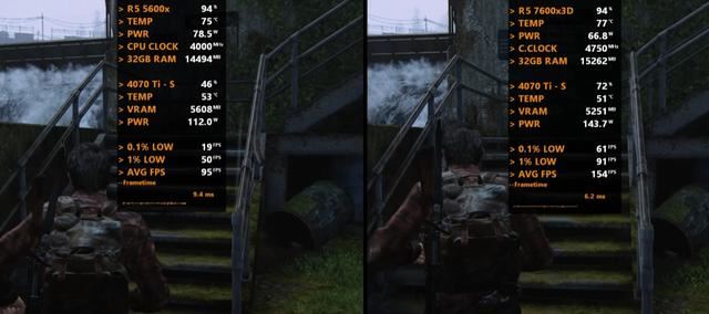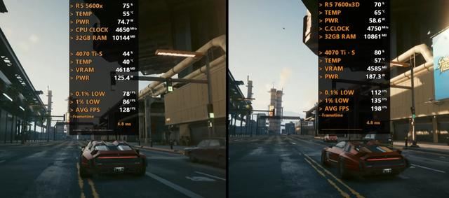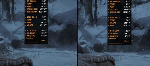 以下将分别测试七款游戏,均采用1080P画质模式,以下系列图片中左边代表Ryzen 5 5600X平台,右边代表Ryzen 5 7600X3D平台。