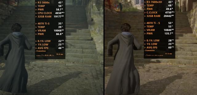 在平均帧速方面,Ryzen 5 7600X3D平台比Ryzen 5 5600X平台高40 FPS,约1.7倍,最低瞬时帧速高29 FPS,帧时间低4ms左右,功耗低13W,温度高5度。