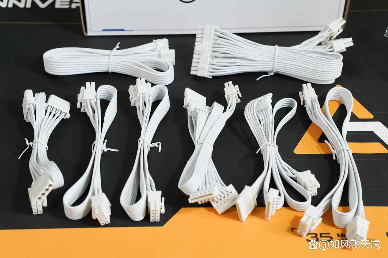 配线也是全白色的,包括24PIN主板供电、2根CPU供电、2根SATA线、1拖2 PCIE供电线,一根12V-2x6显卡供电线,一根大4PIN线,满足各种需求。