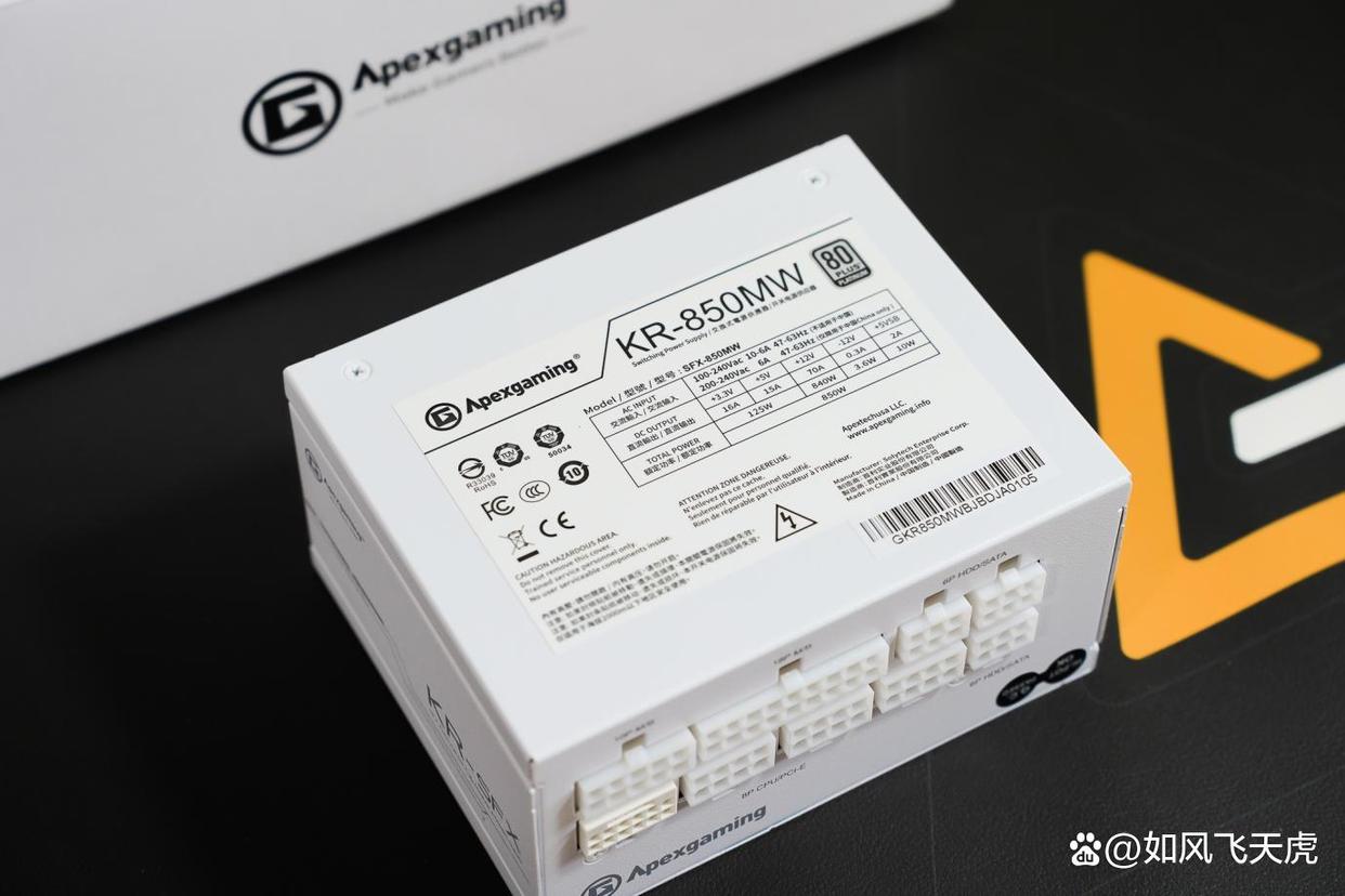 电源非常小巧,背面有各种认证标识和规格数据。总功率950W,12V输出高达840W,支持顶级显卡也是没有问题。全模组接口,包括12V-2x6,主板供电,3个8PIN PCIE/CPU供电接口,3个6PIN SATA供电接口。配件里的8根线正好可以把接口全部插满。