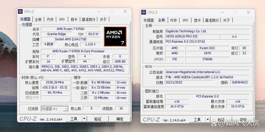 运行CPU-Z,正确识别CPU和主板。CPU R7 9700X,主板X870I AORUS PRO ICE,通道规格PCI-Express 5.0。