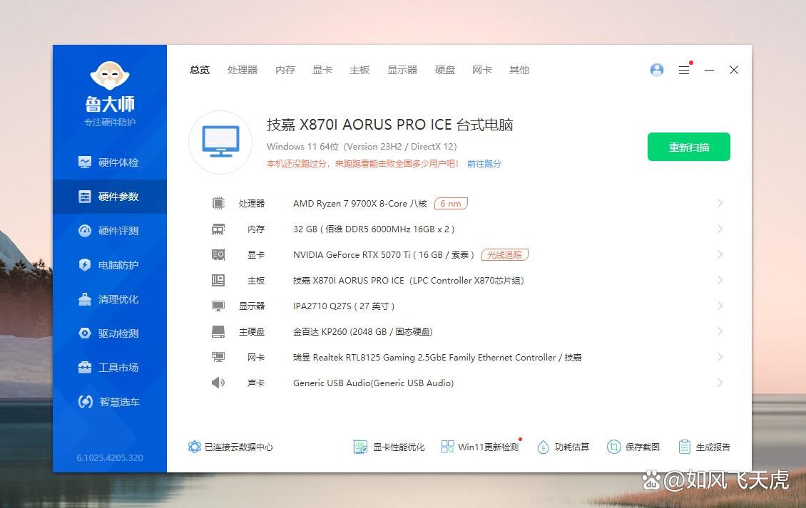 运行鲁大师,配置显示CPU是AMD R7 9700X,内存是佰维DDR5 6000MHz。显卡是索泰RTX 5070Ti,主板是技嘉X870I AORUS PRO ICE。