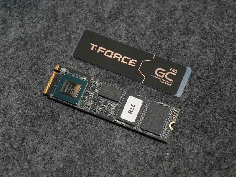十铨T-FORCE GC PRO采用了自家专利的石墨烯散热片来强化散热,不过在出厂时并没有预先安装,这就方便我们根据自行决定散热方案了,比如在采用拉风的主动式SSD散热器时,芯片直触就要比隔了一层散热片的效果好得多。