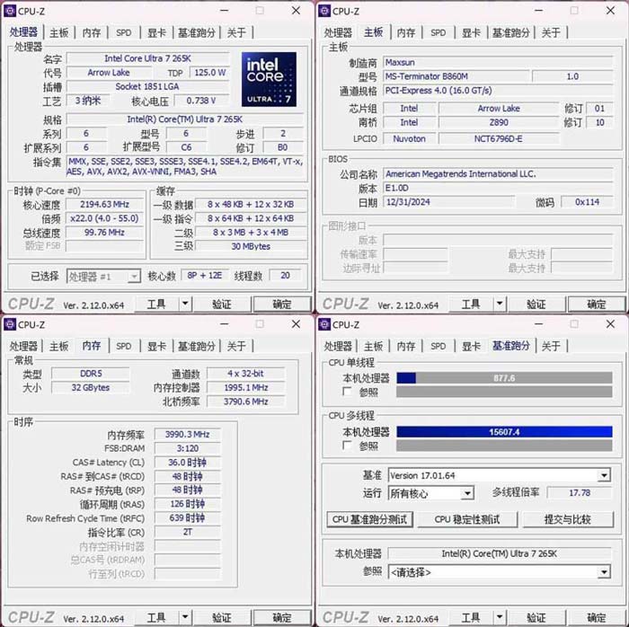 首先用CPU-Z来测试一下,Intel 265K的单核得分为877.6,多核得分为15607.4,丝毫不弱于之前我测试Z890主板时的表现: