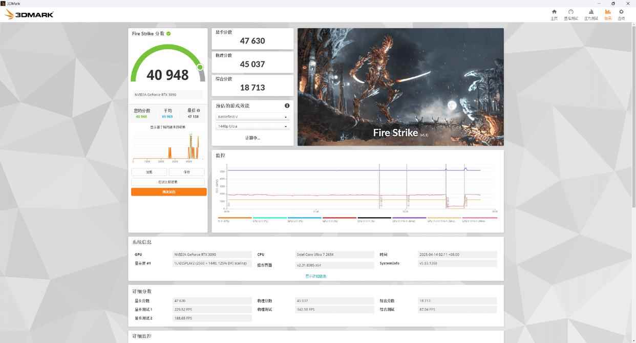 在衡量DX11游戏性能的Fire Strike测试项目中,这台主机取得了40948分,其中物理分数45037分,显卡分数47630分: