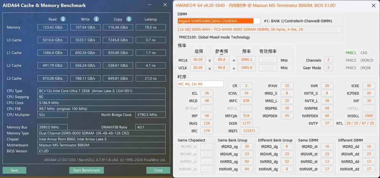 在BIOS将内存直接XMP至8000MHz后,使用AIDA64对内存能效进行测试,测得读取速度为116.43 GB/s,写入速度为93978 MB/s,复制速度为101.49 MB/s,延迟为82.1ns。这个内存读写速率已经非常强了,虽然延迟略高,不过这是Intel 200s处理器的锅,也怪不得主板。
