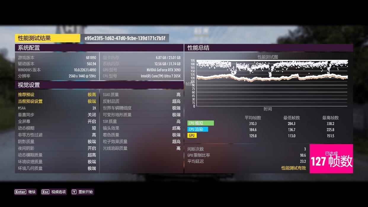 在《极限竞速:地平线5》中,使用2K极高画质档位测试,平均帧为127,基本可以实现流畅高刷:
