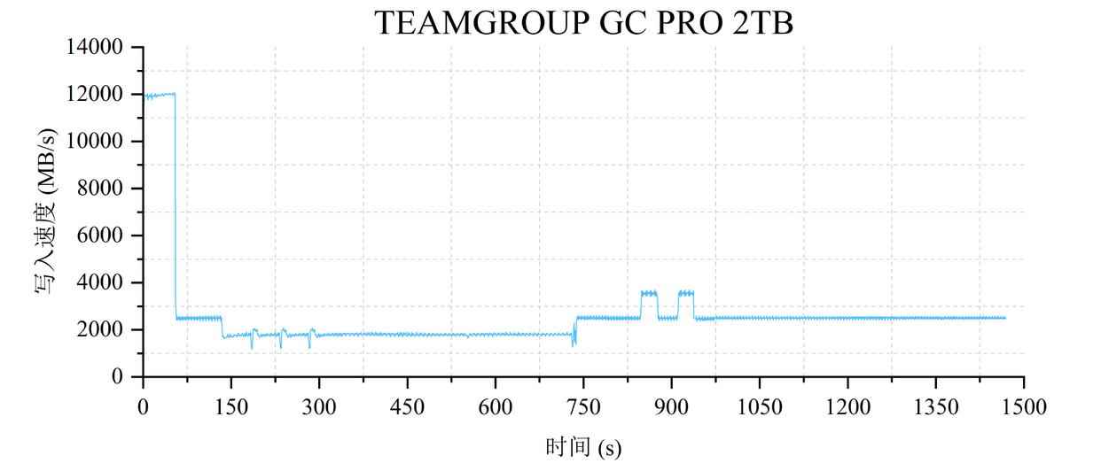 如图所示,十铨T-FORCE GC PRO 2TB的写入曲线呈现典型的三段式结构,其中SLC Cache容量在630 GiB左右,缓内写入速度能维持平均12000 MiB/s以上。