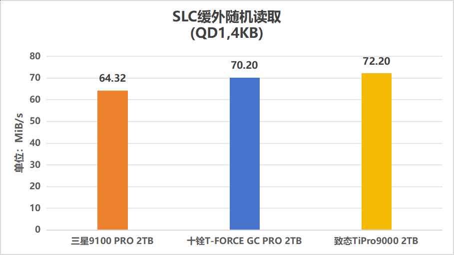 最终记录到的读取性能速度曲线如上图所示,单队列SLC缓外4K随机直读的速度在70.20 MiB/s左右,这个表现已经超过了三星9100 PRO 2TB,接近了致态TiPro9000 2TB,让我大吃一惊: