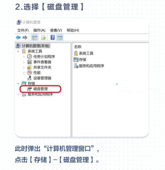 2. 此时弹出“计算机管理”窗口,点击【存储】-【磁盘管理】。