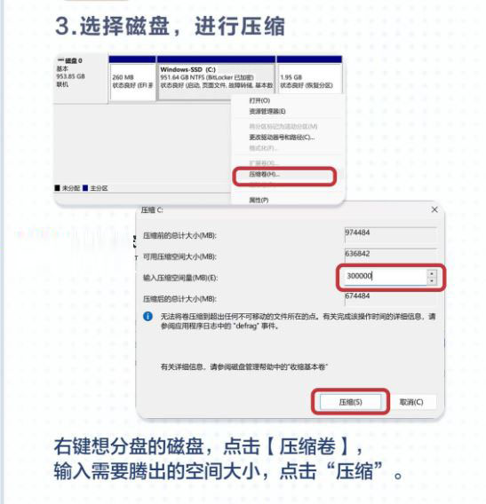 3. 右键想分盘的磁盘,点击【压缩卷】,输入需要腾出的空间大小(注意为C盘留出空间哦~),点击“压缩”。