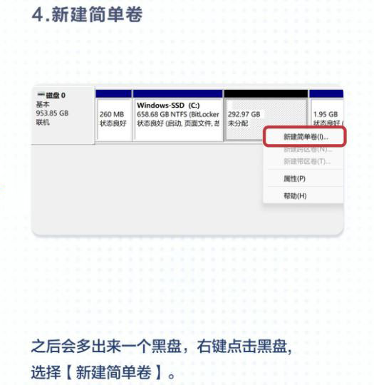 4. 然后会多出来一个黑盘,右键黑盘,选择【新建简单卷】。