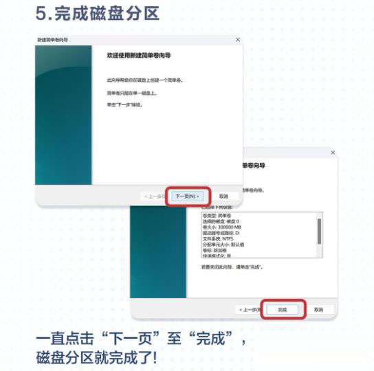 5. 一直点击“下一页”至“完成”,磁盘分区就完成了!