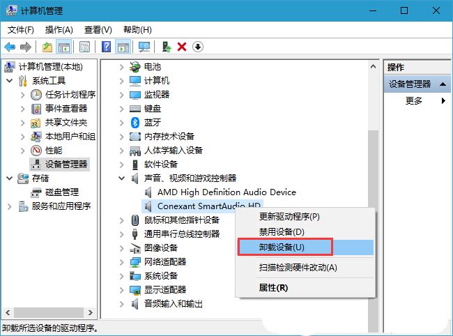 2、计算机管理窗口中,点击左侧的设备管理器,然后在右侧找到并展开:声音、视频和游戏控制器,点击右键,在打开的菜单项中,选择卸载设备,同理,显卡驱动也是按照这样的方法卸载;