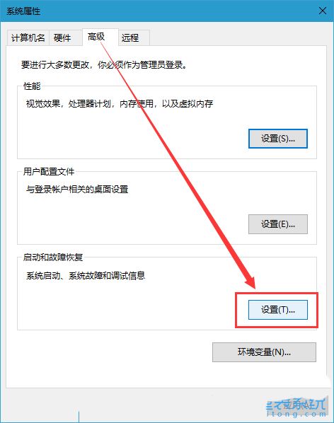 桌面右键点击此电脑,在打开的菜单项中,选择属性,系统属性窗口中,切换到高级选项卡,然后点击下方的启动和故障回复 - 设置;