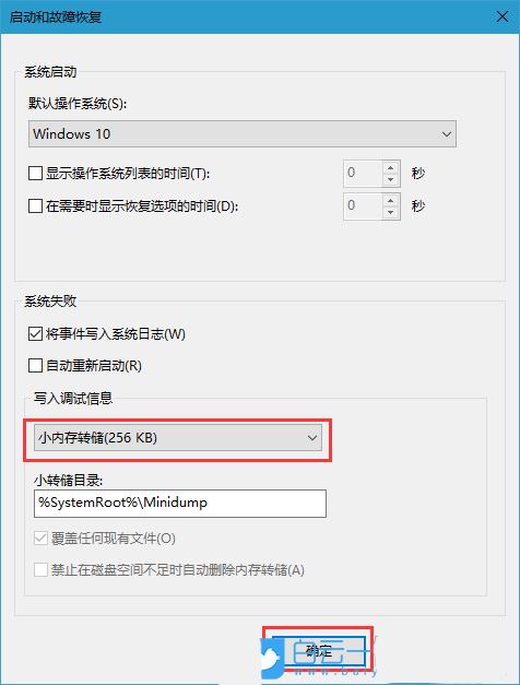 启动和故障恢复窗口中,写入调试信息 - 选择“小内存转储(256KB)”,路径选择默认,勾选将事写入系统日志,确定并重启电脑;