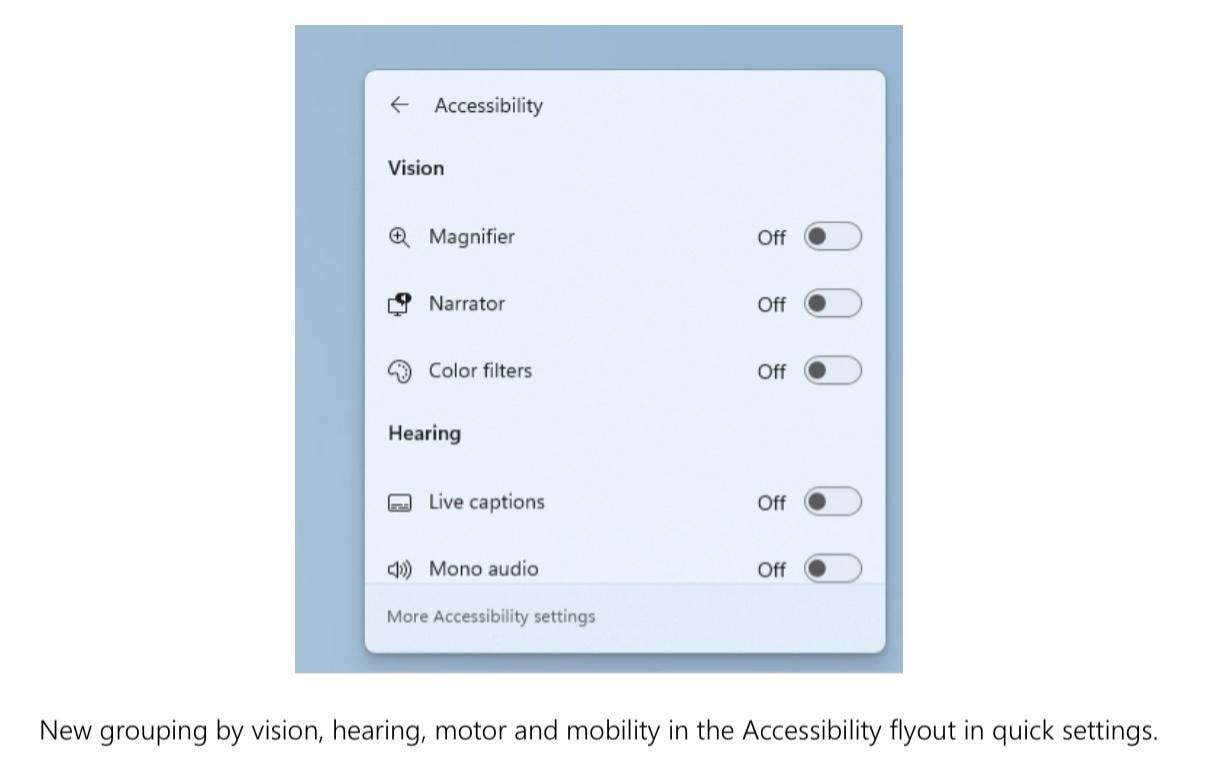 微软重构了快捷设置中的“辅助功能”菜单,按视觉、听觉、动作和行动能力分组,同时整合了语音访问功能。