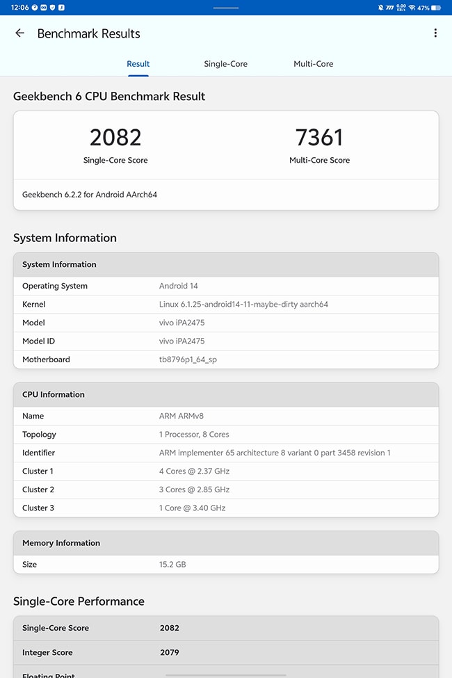当然,iQOO Pad2 Pro的理论性能跑分也不会差,在安兔兔中的综合跑分成绩轻松站上了212万分大关,在Geekbench6的多核成绩为7361分,单核成绩为2082分,这样的成绩已经达到了目前平板市场的天花板级别。