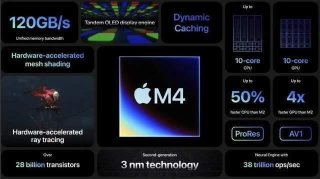 性能方面,苹果称全新iPad Pro搭载了全新的M4芯片。新CPU具有四个性能核心和六个效率核心,支持光线追踪和网格着色,与M2相比,整体渲染性能提高了4倍。M4提供与M2相同的性能时,功耗仅为M2的一半。