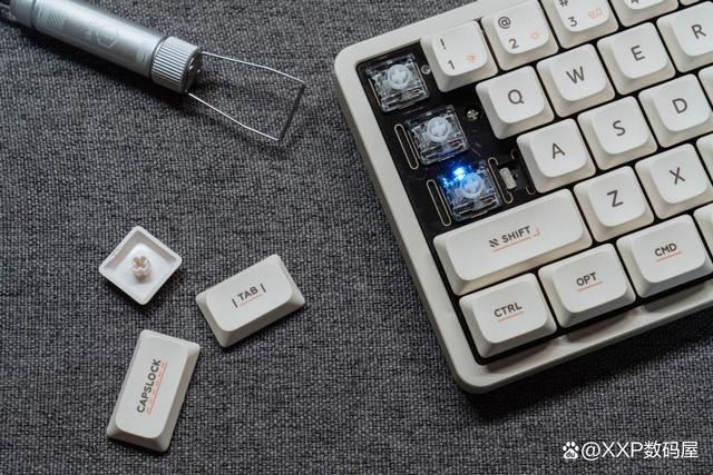 标配高含量PBT材质+抗污涂层的键帽,字符非常清晰,不易脱色磨损,做工细致。以前ABS材质的键帽基本上大半年就出现打油了,而且字符脱色。键帽顶部还是凹形设计,更符合指腹的人体工学,敲击起来贴手Q弹。