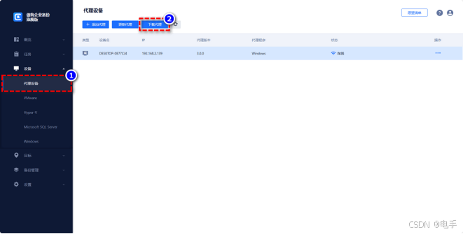 1.在傲梅官方网站上 访问下载中心获取并安装傲梅企业备份旗舰版。先安装代理客户端,所以请您在主机端登录傲梅企业备份旗舰版,在主界面点击“设备”>“代理设备”>“下载代理”。