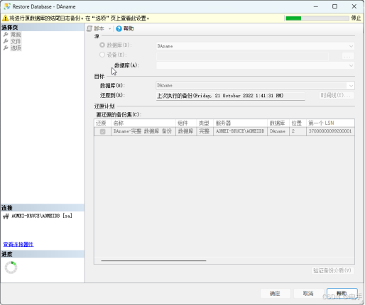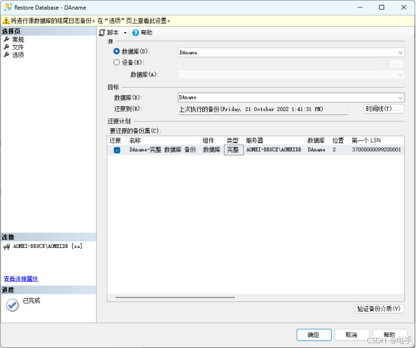 3.如果没有问题,备份信息将显示在恢复数据库窗口中,然后您可以单击“确定”从bak文件中恢复SQL数据库。