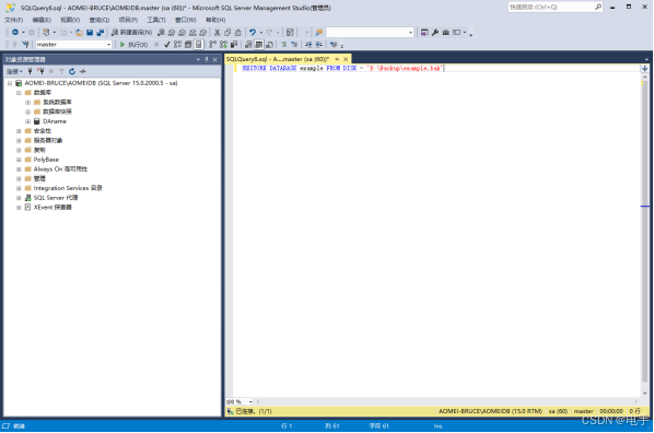 使用 T-SQL 语句从 .bak 文件恢复 SQL 数据库是一种灵活且直接的恢复方法,适用于需要精细控制恢复过程的场景。通过 T-SQL,您可以指定恢复的数据库名称、文件位置以及恢复选项。以下是使用 T-SQL 语句从 .bak 文件恢复 SQL 数据库的详细步骤: