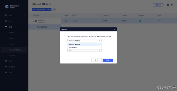 2.验证数据库实例. 安装完代理客户端并成功建立控制连接之后,在主机端点击“设备”>“Microsoft SQL Server”,找到您的数据库,点击其右侧的三个小点图标,选择“身份验证”方式,在弹出窗口中选择“SQL身份验证”,输入账户密码,点击“验证”即可。