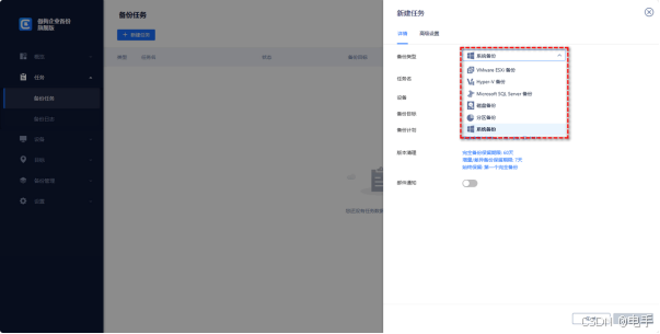 选择备份类型:在弹出页面中点击备份类型下拉菜单,选择“Microsoft SQL Server备份”。