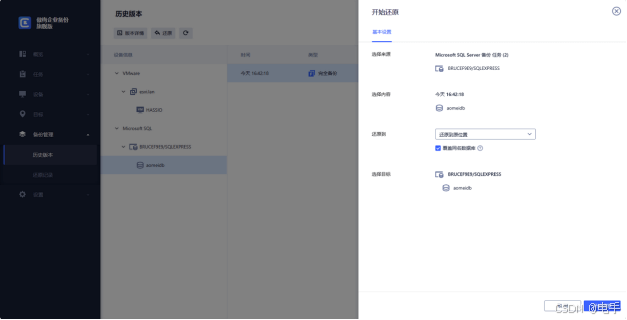 在需要将Sqlserver备份文件还原时,转到任务选项,找到备份的任务记录(或者在备份管理中的历史记录中找到数据库备份版本,或者在还原记录中新建还原任务),选择右侧的三点图标,点击选择“还原”。在还原内容部分选择需要还原的数据。然后选择还原到源位置还是还原到其他位置,再选择对应的设备。确定没有问题后点击“开始还原”。