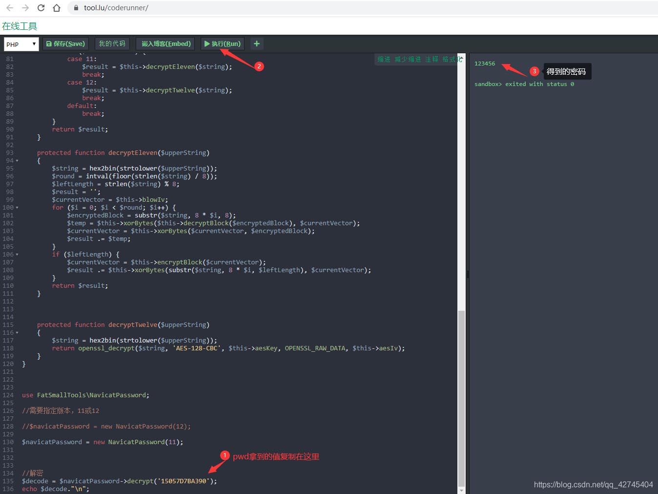 $decode = $navicatPassword->decrypt('15057D7BA390');