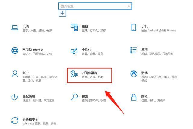3.进入电脑系统的“设置”界面以后,找到“时间和语言”选项: