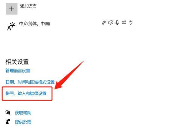 接下来咱们再改动下系统默认输入法,在“添加语言”界面的下方,找到“拼写、键入和键盘设置”选项: