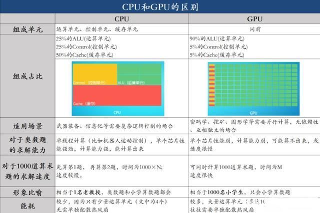 GPU:只可以计算简单的1+1算术题,不能计算复杂的微分积分,1000个运算单元属于小学生水平。