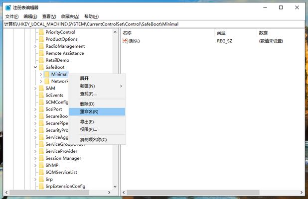 3、如果“Minimal”及 “Network”项被重命名了,再次将其重命名为“Minimal”及 “Network”后就能解除安全模式的禁用了。
