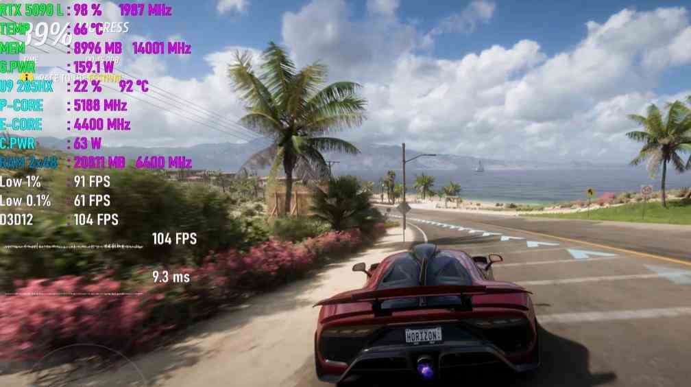 平均帧速为104 FPS,最低瞬时帧速为91 FPS,帧时间为9.3ms,CPU使用率为22%,功耗为63W,温度为92度,内存使用量为20.8GB,GPU使用率为98%,显存使用量为9.0GB,功耗为159W,温度为66度。