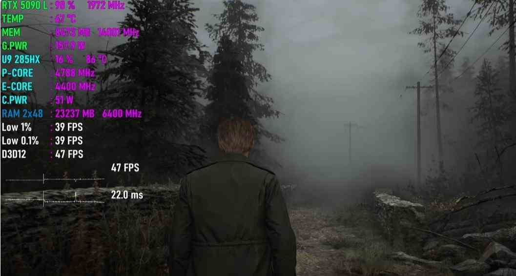 平均帧速为47 FPS,最低瞬时帧速为39 FPS,帧时间为22.0ms,CPU使用率为16%,功耗为51W,温度为86度,内存使用量为23.2GB,GPU使用率为98%,显存使用量为8.5GB,功耗为158W,温度为67度。